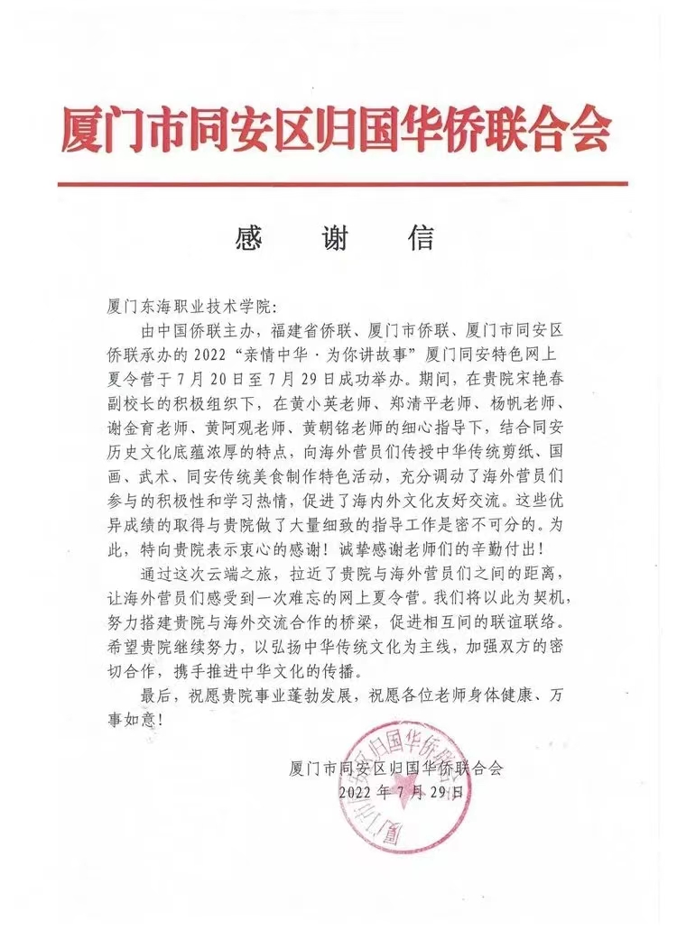由中国侨联主办,福建省侨联、厦门市侨联、同安区侨联承办,北美华人华裔寻根协会和厦门东海技术学院共同协办的2022年“亲情中华•为你讲故事”厦门·同安特色网上夏令营于美国东部时间7月29日21:00和北京时间7月30日9:00同步圆满落下帷幕了。来自同安区侨联全体人员、北美华人华裔寻根协会领导、厦门东海职业技术学院领导及任课老师、夏令营班主任及义工老师、营员家长和59名美国、菲律宾、马来西亚、加拿大华裔青少年们一起通过线上直播平台方式参加闭营仪式。