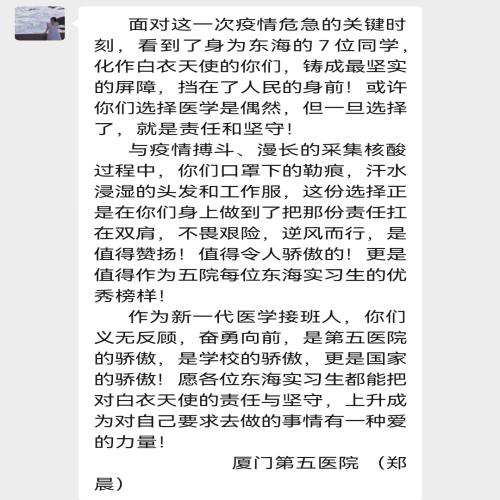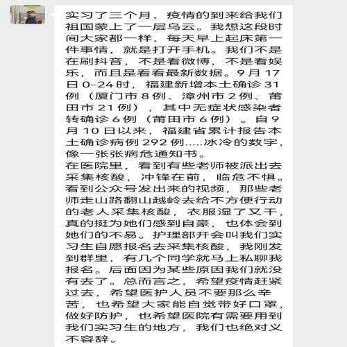 健康产业学院2019级护理专业的同学,他们在各大医院也以实习将近3月,面对着厦门不断严峻的疫情形势,她们也都想着尽自己的一份力量,为了这个美丽的城市,为了身边同学、朋友的健康,为了不愧于他们在授帽仪式下的宣誓,忠实履行着自身的职责,坚守在各实习医院,坚守在各自的岗位。在厦门各个医院院内征集核算采样志愿者时,健康产业学院2019级护理专业的同学积极报名,展现了作为医护工作者身上的那份担当。