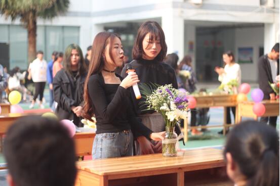 参赛代表上台就作品的寓意进行讲解,待所有组员展示完后比赛也接近了尾声,商学院团总支书记黄阿观老师为这次插花节做出精彩点评,并合影留念。