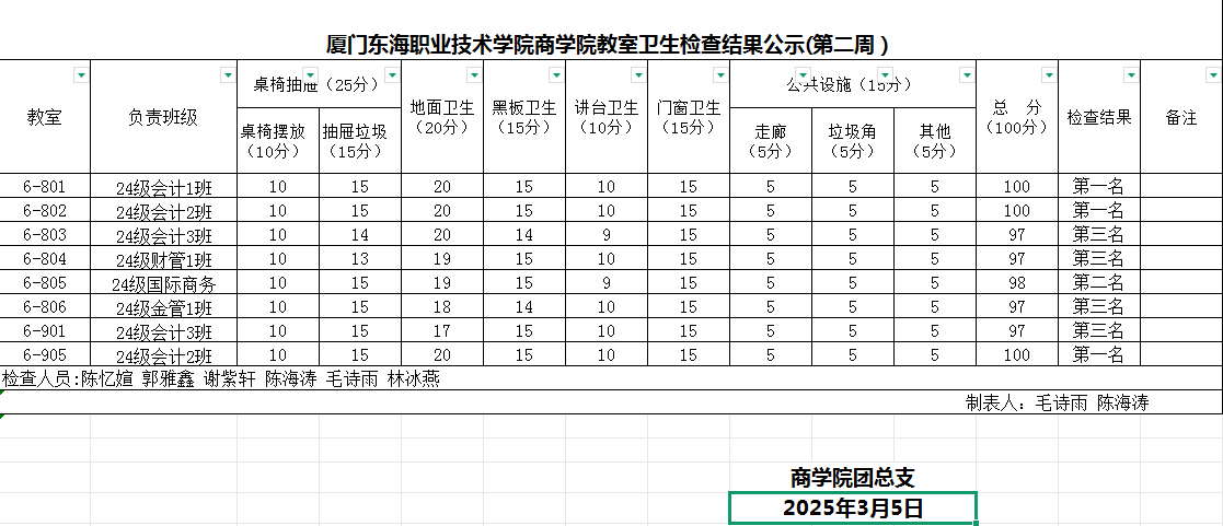 2024-2025学年第二学期商学院第1周班级卫生评比