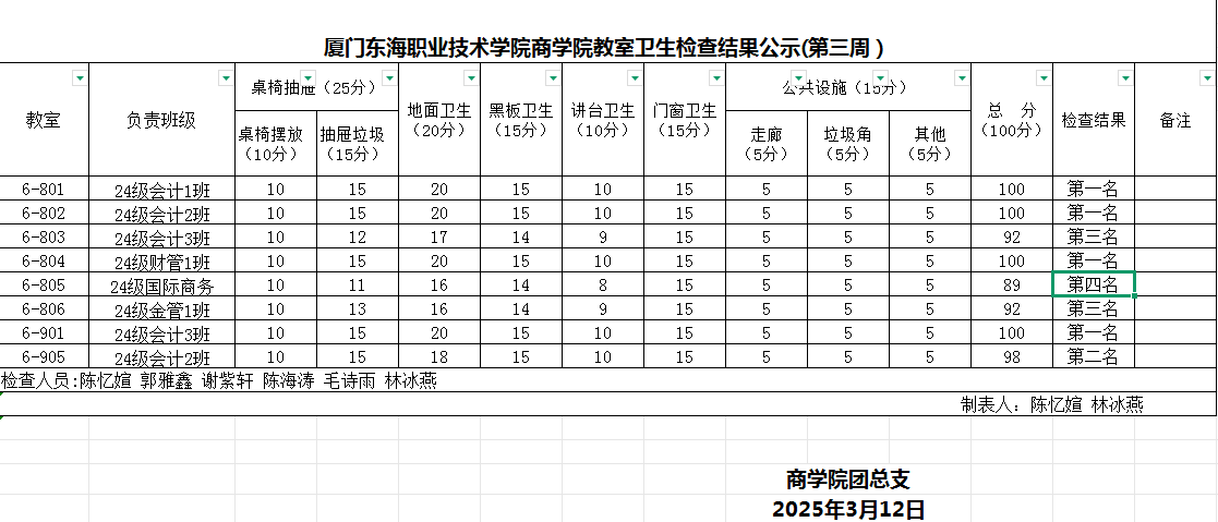 2024-2025学年第二学期商学院第4周班级卫生评比