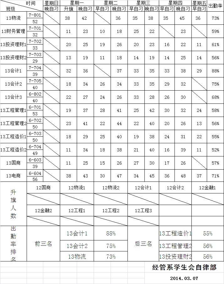 [组图]经管系2013-2014下学期第四周早晚自习出勤排名