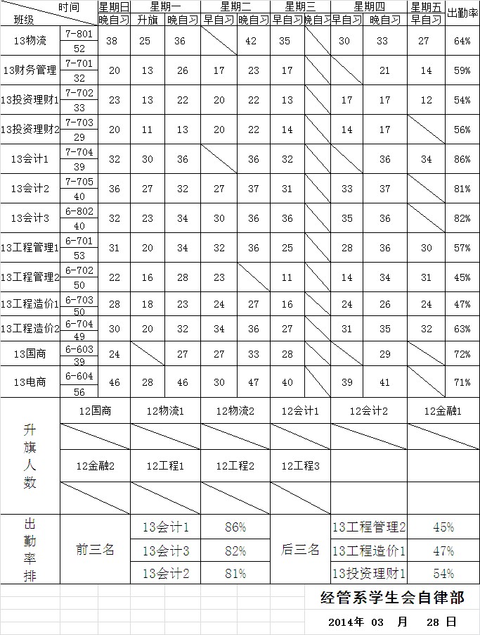 [组图]经管系2013-2014下学期第七周早晚自习出勤排名