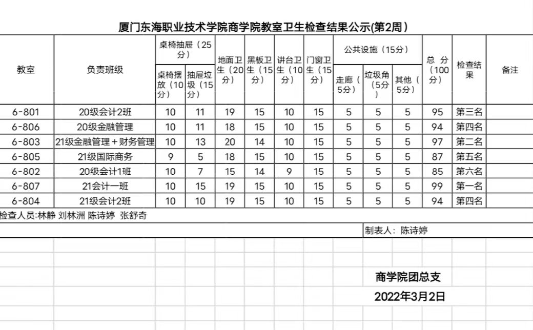 2021-2022年第二学期商学院第二周班级卫生评比