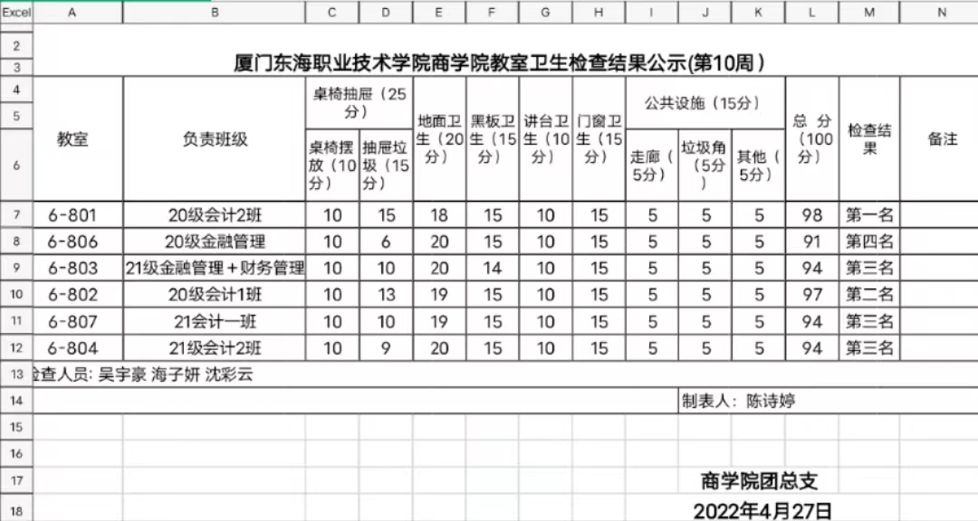 2021-2022年第二学期商学院第十二周班级卫生评比