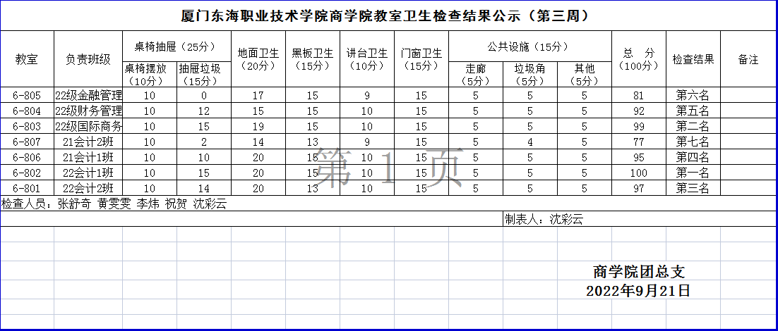 2022-2023学年第一学期商学院第三周班级卫生评比