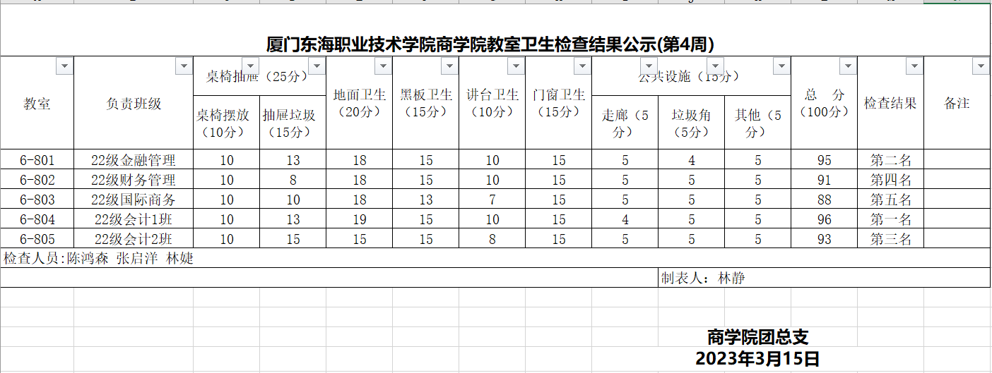 2022-2023学年第二学期商学院第4周班级卫生评比