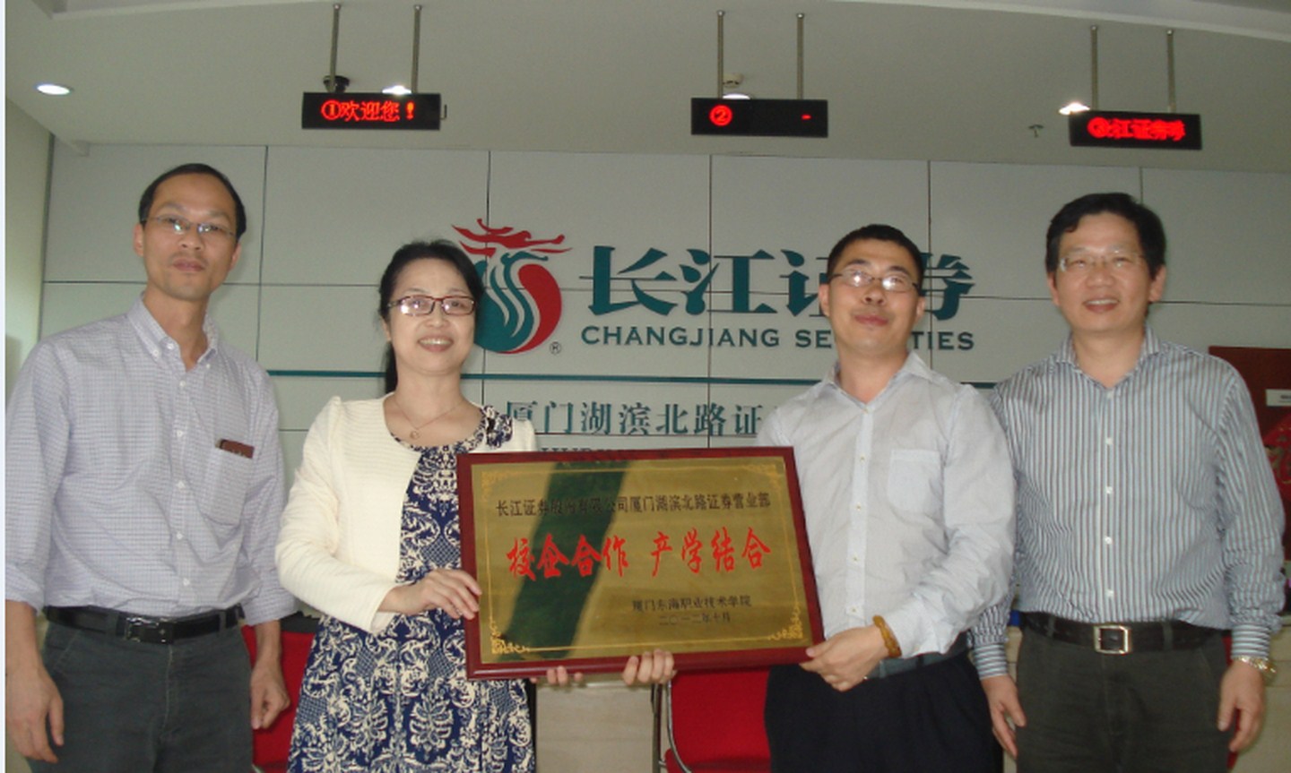 4月16日,学院杨芝萍副院长、教务处杨先林处长、我系投资理财教研室林宗保主任前往长江证券投资有限公司厦门湖滨北路证券营业部进行校企合作实习基地挂牌仪式。